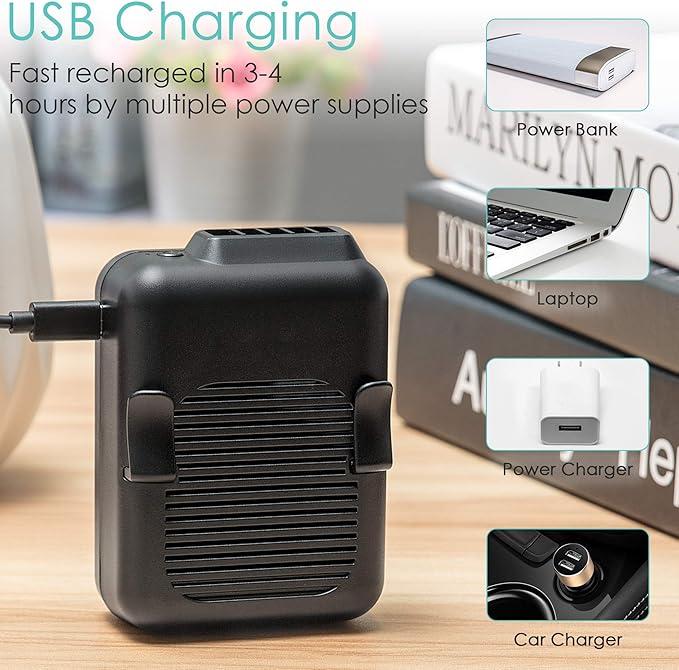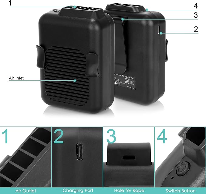 - What You Get: (1) Portable Mini Waist Fan; (2)USB Cable; (3) Neck Strap; (4) User Manual