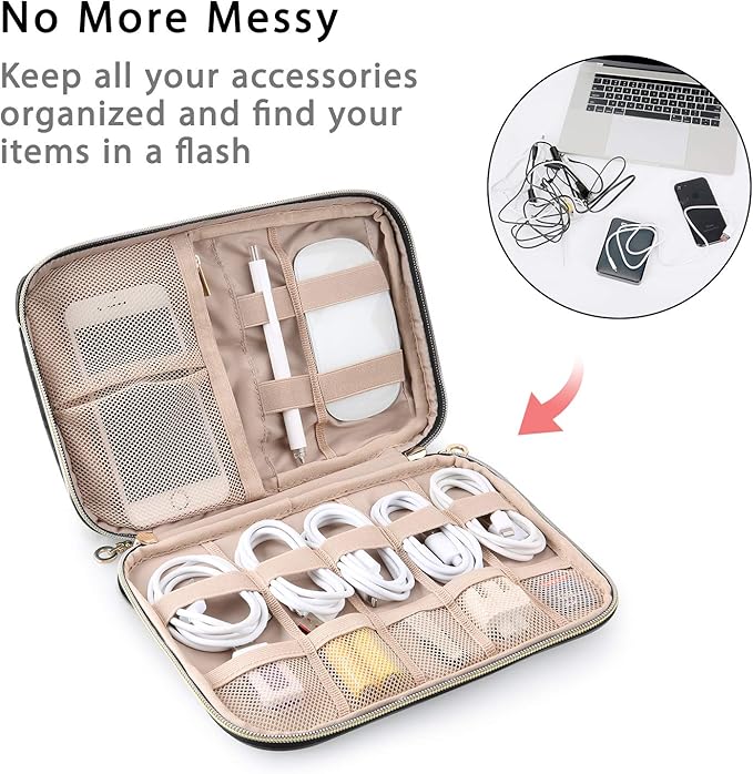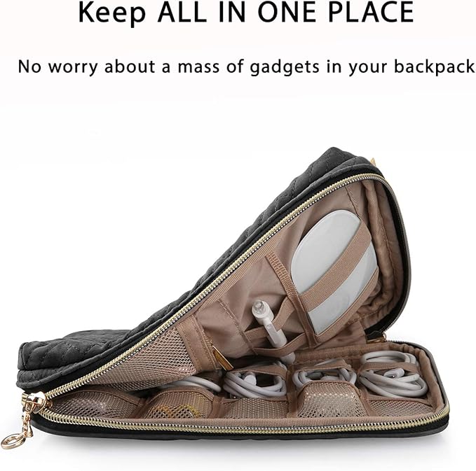 - Compatible Space: The electronics storage bag keeps all gadgets in one place, 5 elastic loops(S) for slender cables, earphones, or pens, 2 elastic loops(L) for longer cables or computer mice, 1 mesh zippered pocket, 5 elasticized mesh segments, and pocket under the zippered pocket to store USB drives, power banks, USB-C hub, dongles