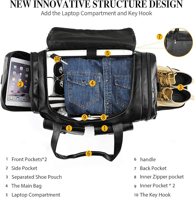 - ♘EASY & COMFORTABLE to USE - the bag owns an oversized main compartment to stash your travel necessities for 2-3 day trip ; 2 External Front Pocket with Leather Cover, 1 Side Zippered Pocket, 1 side Zippered Shoes Compartment, 1 Zippered Pocket on the end of bag; The strap is built along with an adjustable thick & broad cushioned pad, which helps make your shoulder more relaxing and free of pains and less fatigue.