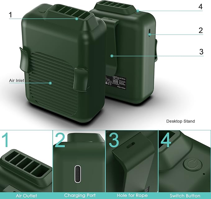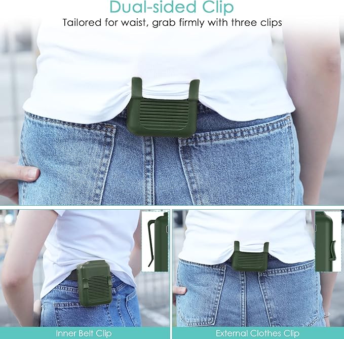 - 3-in-1 Waist Fan: This waist fan with compact size is specially designed with dual clips. The bigger one on the back for the belt and pants, while the smaller ones in front for fixing clothes corner. Plus, a necklace strap is included for better portability. You can clip the fan to waist, hang it around neck, or just hold it by hand to bring cool breeze everywhere