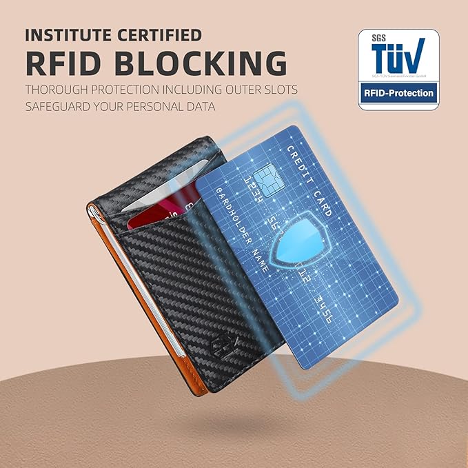 - RFID BLOCKING:Our wallets for men are equipped with German institute certified RFID SECURE Technology, a unique metal composite, engineered specifically to block 13.56 MHz or higher RFID signals and protect the valuable information stored on RFID chips from unauthorized scans