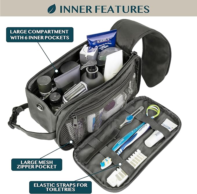 - WATER RESISTANT TOILETRY BAG DOPP KIT: This toiletry case kit is made from high density PU leather with added side padding for durability and extra protection to keep your toiletries safe and protected during travel. The lining is water-resistant to prevent liquid splashes from entering the bag or luggage. The toiletry bag also offers excellent wet/dry separation so you can keep wet accessories in a separate compartment from dry toiletries during camping, road trips, weekenders.