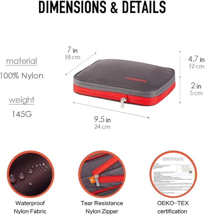 - PERFECT for TRAVEL - 26L(XLarge) for winter coats, sweaters, pants. 15L(Large) for shoes, jeans, t-shirts and shorts. 9L(Medium) forunderwear, bras, socks, and smaller/thinner garments of clothing. LITE Gear Pouch for cards, cash, tech data cable, cosmetics, toiletry etc.