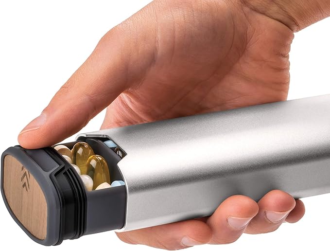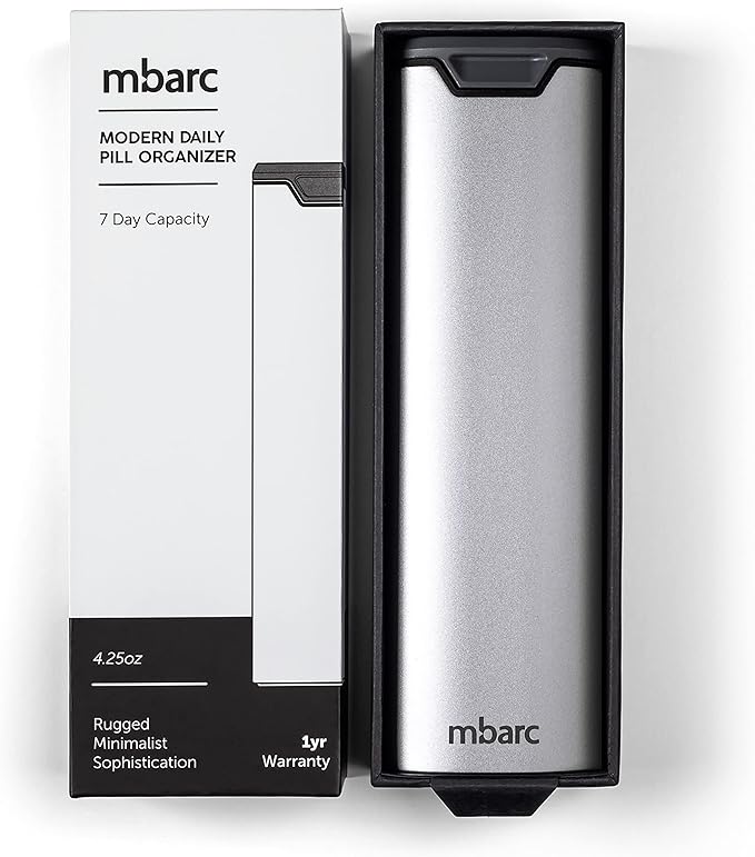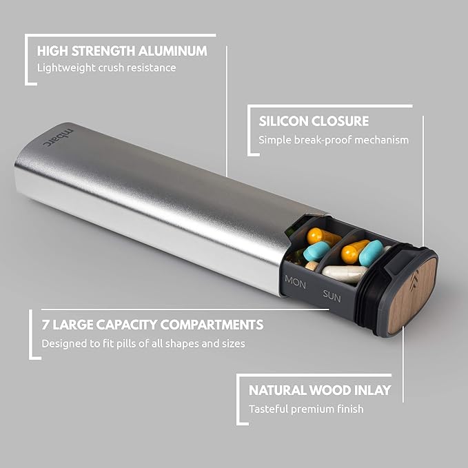- PREMIUM MINIMALIST STYLE - The mbarc pill container is crafted from ultra-strong and light anodized aluminum tubing. It features a durable polymer slide out pill tray that will safely and securely organize your pills. The clever silicone rib sealing mechanism means there are no plastic closure tabs to fail or break. Real cherry wood inlaid accents provide class and guarantee your pill case will turn heads as a modern and elegant pill container