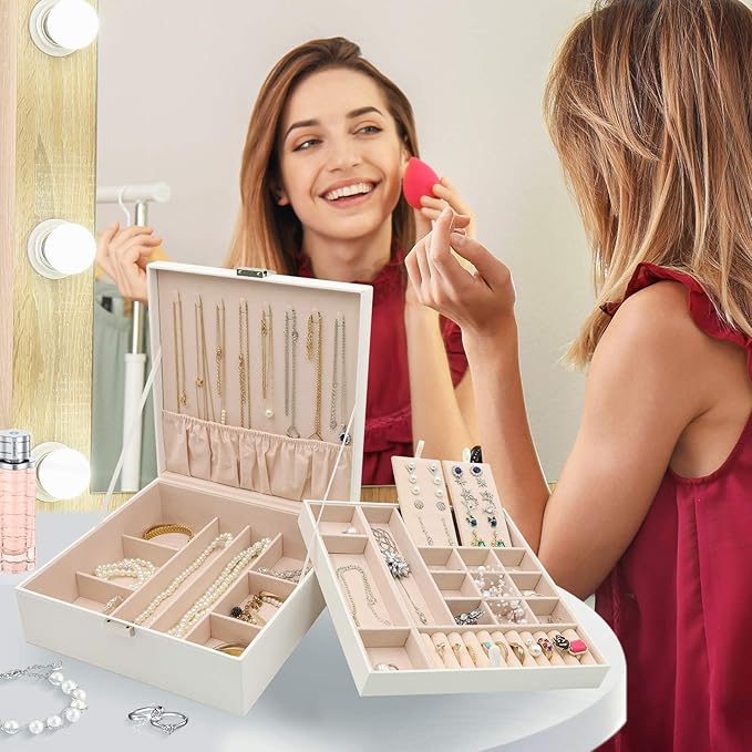 ProCase Jewelry Box for Women, 2 Layers Large Leather Jewelry Organizer Storage Case with Removable Pad for Earrings -White