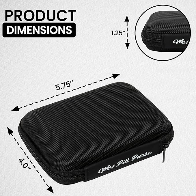 - Printed on: The logo is printed on the outside My Pill Purse black pill case size 5.5 inches long 4 inches wide and 1.75 inches thick. The brand is printed on the seam with classic writing to ensure brand quality and not look-alikes. This small travel pill case for medicine bags is compact, so if you may consider having 2 vitamin cases pill organizers. Use one pill holder for a vitamin case and the other cute pill organizer for medicine.