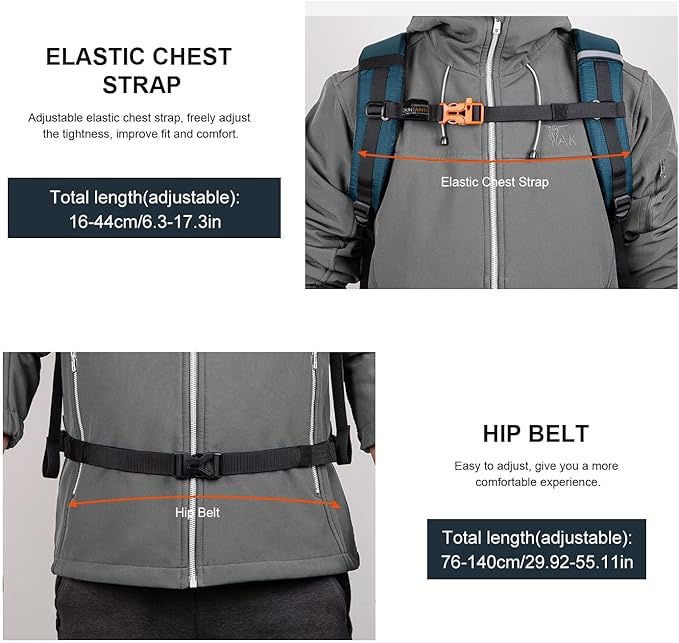 - 【Flexible Design】: This hiking backpacks features an adjustable waist belt suitable for waist circumferences of 29.92-55.11 inches, and the abdominal belt can be removed by itself. The design of the breathable sponge back panel and shoulder straps helps to relieve shoulder pressure and reduce the overall burden when hiking or climbing outdoors.