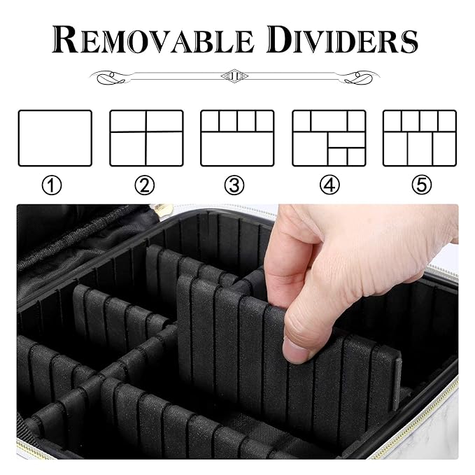- Spacious & Adjustable Storage:The 10.23 x 9.05 x 3.74-inch Travel makeup Bag offers with 6 adjustable dividers, allowing you to customize compartment sizes to fit various makeup items, brushes, and accessories perfectly.