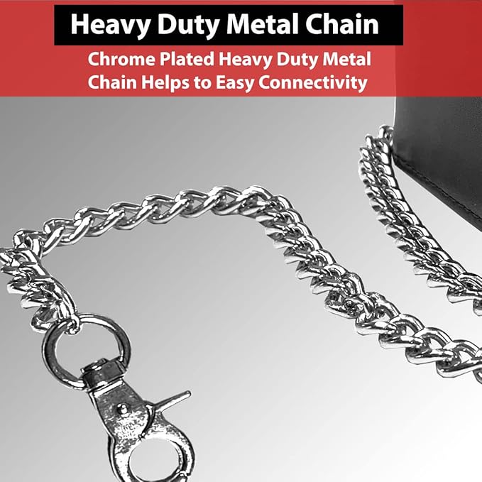 - RUST FREE METAL CHAIN: This biker wallet for men includes a heavy duty 18" removable metal chain with a secure dog lock clasp. Built to last and resist rust, it attaches easily to your belt loop to keep your wallet safe, secure, and perfect for bikers, truckers, or anyone who values style with reliable protection.