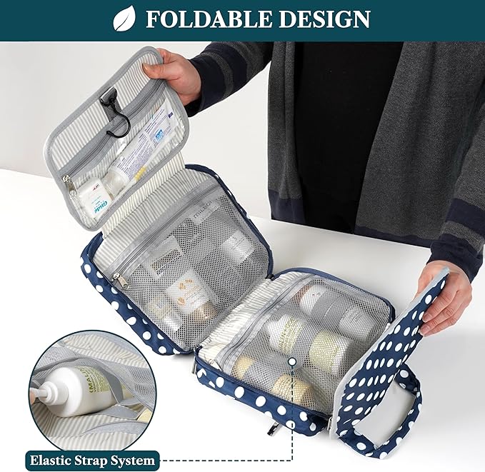 PAVILIA Hanging Toiletry Bag Travel Bag Women Men, Foldable Cosmetic Organizer, Roll up Makeup Bag, Water Resistant Accessories Toiletries, Large Travel Essentials Kit (Navy Polka Dot)