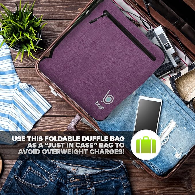 Bago Foldable Duffel Bags for Traveling Women & Men - 60L Medium Packable Duffle Bag for Travel with Shoe Compartment - Water Repellant, Heavy Duty, Lightweight Folding & Collapsible (SnowDepPurple)