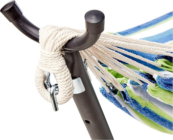 - Double hammock made of comfortable cotton & polyester with an Oasis Blue Stripe design, a steel stand, and a carrying case for the hammock