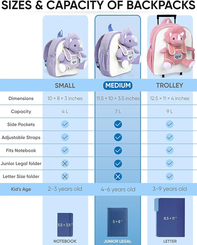 - Functionality: Triceratops Backpack for toddlers a great 2-5 year old girl, boy gifts, has padded straps with good adjustability and a sturdy zipper; it’s easy for toddlers to open and close; medium backpack - size 11.5" × 10" × 3.5"