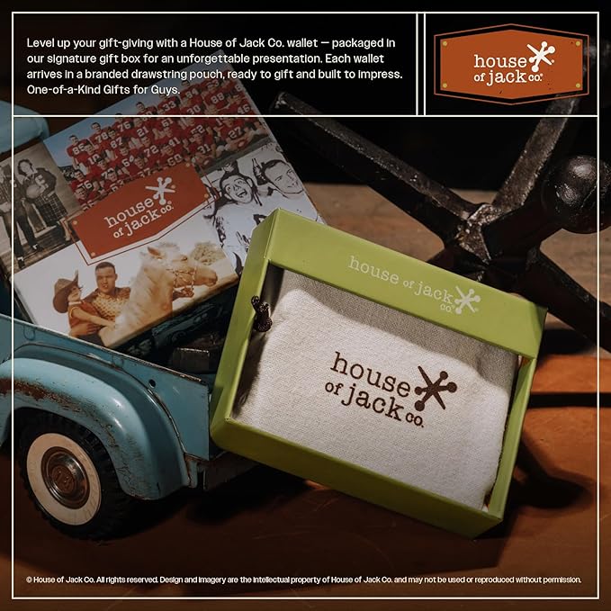 - ELEVATE your gift-giving experience with a House of Jack Co. wallet—thoughtfully packaged in our signature gift box for an unforgettable presentation. Each wallet arrives in a branded drawstring pouch, ready to gift and ready to impress. Gift-giving made easy!