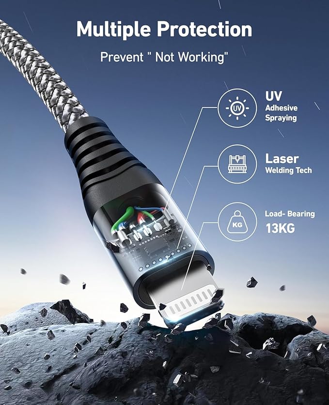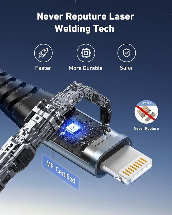 - Triple Protection USB to Lightning Cable: The iPhone charger fast charging cable built-in an Apple smart chip to ensure 100% compatibility with all iPhone and iOS devices with lightning port; it built-in laser welding technology, which ensure the metal part won't break. The copper core part is reinforced with UV glue to prevent the solder joints from falling off.