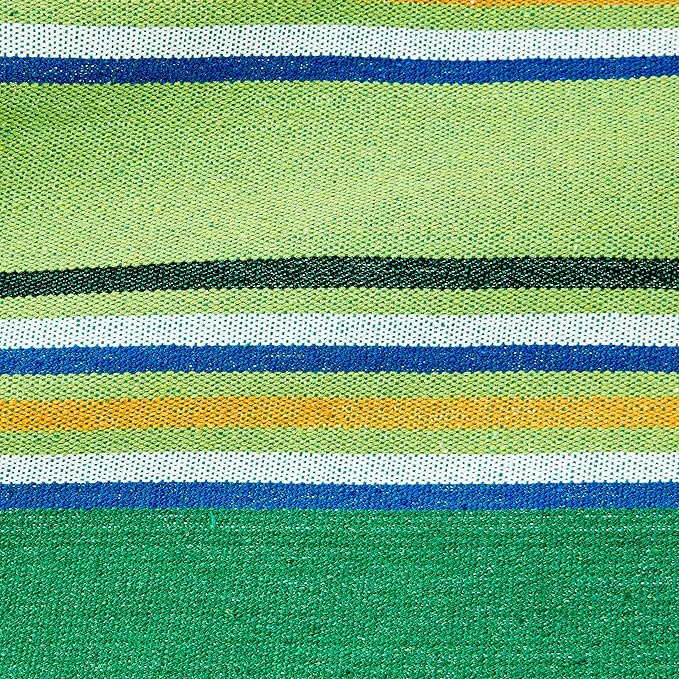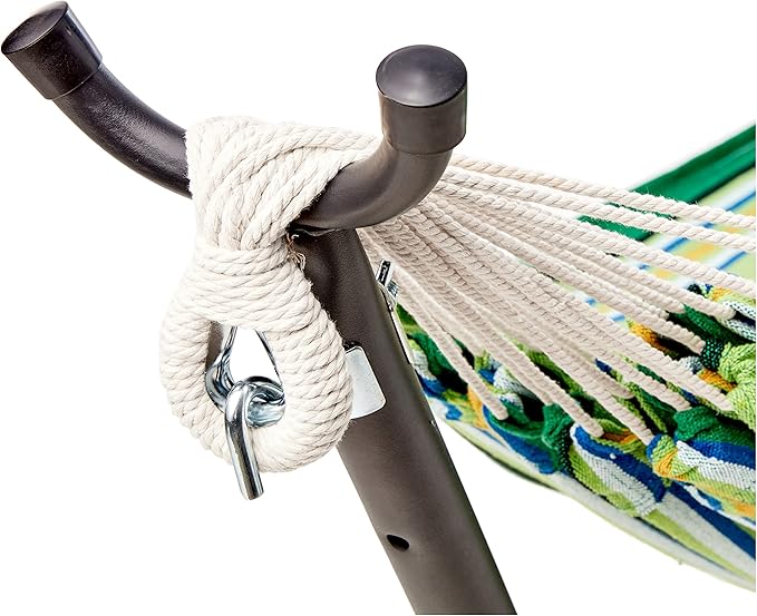 - Double hammock made of comfortable cotton & polyester with a Green Stripe design, a steel stand, and a carrying case for the hammock