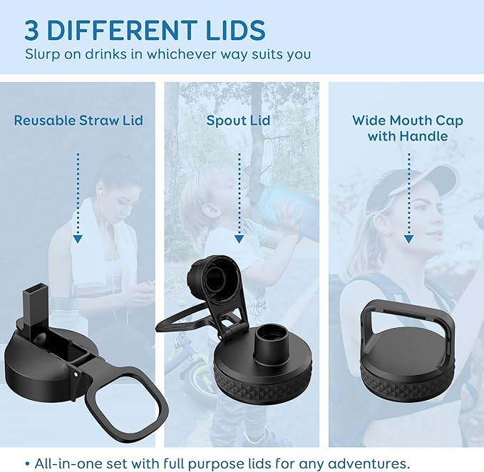 - Flexible Drinking On-the-Go: This water jug comes with 3 different lids. The screw-on lid with flip-up handle is for easy ice refilling with superior portability; spout lid makes it convenient to drink hot liquid and straw lid for sipping cold
