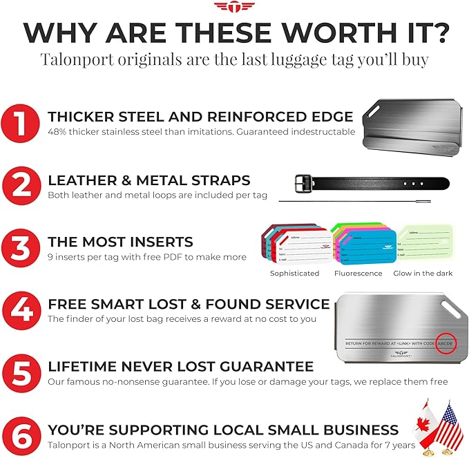 - THICKEST STAINLESS STEEL WITH UNIQUE REINFORCED EDGE - You’ve found the original creators of the best metal 4 pack luggage tags set. Talonport originals are indestructible and guaranteed to be the last suitcase tags you’ll ever need to buy. Don’t settle for lesser quality imitations.