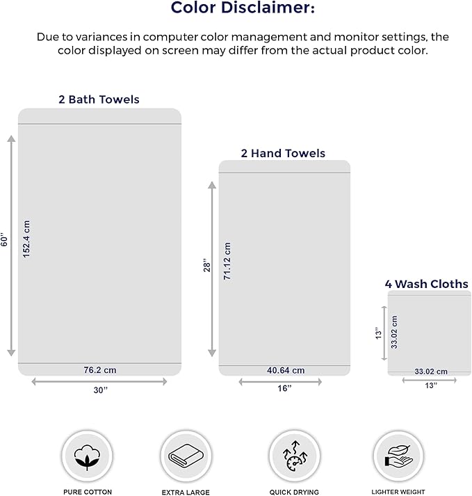 - This package contains 2 extra large bath towels 30 x 60 in, 2 hand towels 16 x 28 in and 4 washcloths 13 x 13 in
