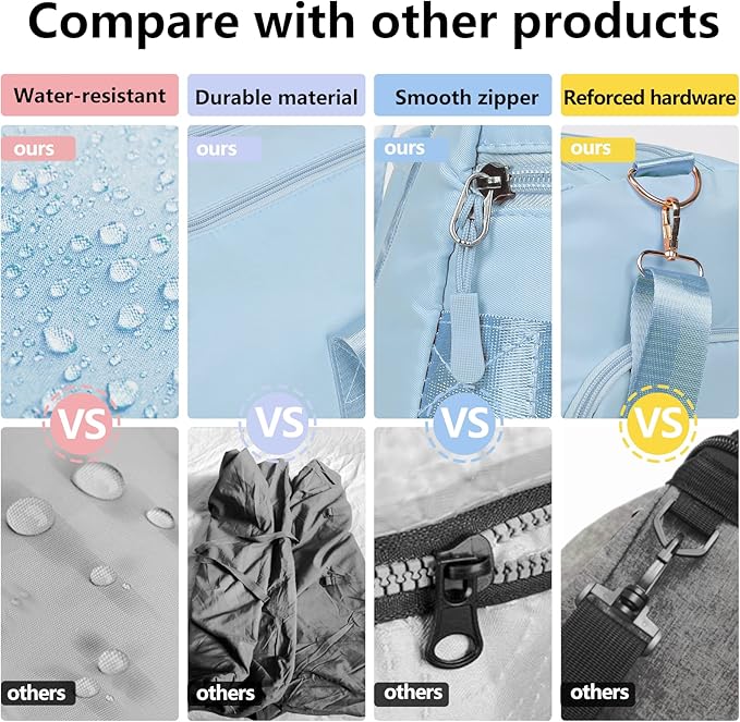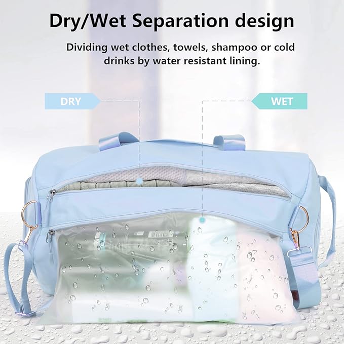 - DRY WET SEPERATED DESIGN & SHOE COMPARTMENT: The high density waterproof pocket can help you to divide wet clothes, towels, shampoo or cold drinks. Built-in shoe compartment keeps your shoe storage private and fresh. Additional storage pockets to organize your items and necessities.