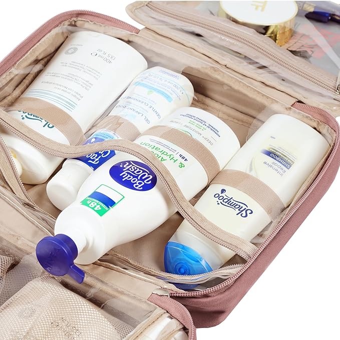 NISHEL Travel Toiletry Bag for Women Large Capacity, Makeup Essentials Organizer, Hanging Case for Accessories, Cosmetics, Rosewood-Pink