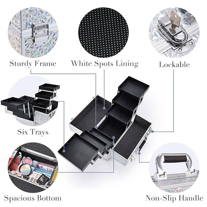 - Makeup Train Case with 6 Trays: The extendable cantilever tray with six tiers offers a spacious and practical storage solution, featuring a roomy bottom area for all your essentials. The design is enhanced by unique white spots, making it a perfect gift for women and girls who value function and style. Its flexible storage options accommodate various cosmetics, from daily toiletries to nail polishes, essential oils, jewelry, paintbrushes, and crafting tools. The large bottom space is ideal for palettes and travel-size bottles, keeping everything organized and easily accessible.