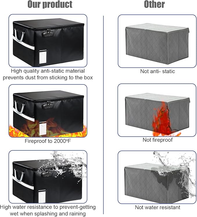 - Fireproof and water-resistant safe: The exterior material of Fireproof File Box is made of upgraded anti-static silicone coated fiberglass, which can withstand temperature up to 2000℉. Fireproof Document Box is not only fireproof but also highly water-resistant, so you don't have to worry about your important documents getting wet by rain.(Does not include folders)