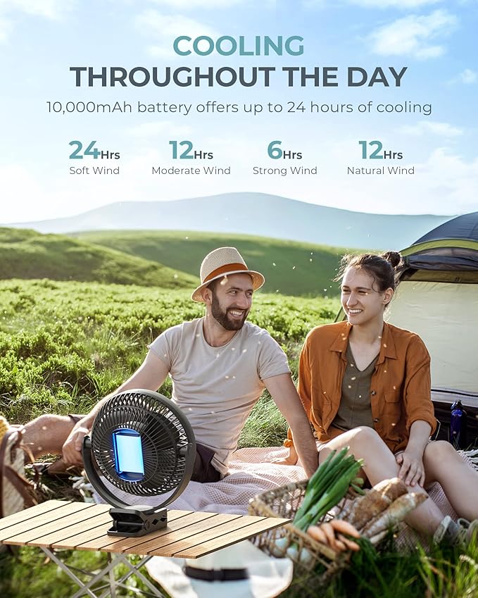 - Quick Recharge yet Long Lasting Battery: This battery fan comes along with a 10000 mAh battery. It has the potential to operate for an entire day with a full charge. With its USB-C port and micro USB port, it offers 10W charging speed. Thus the fan gets charged 50% faster. It gets fully charged within only 6 hours.