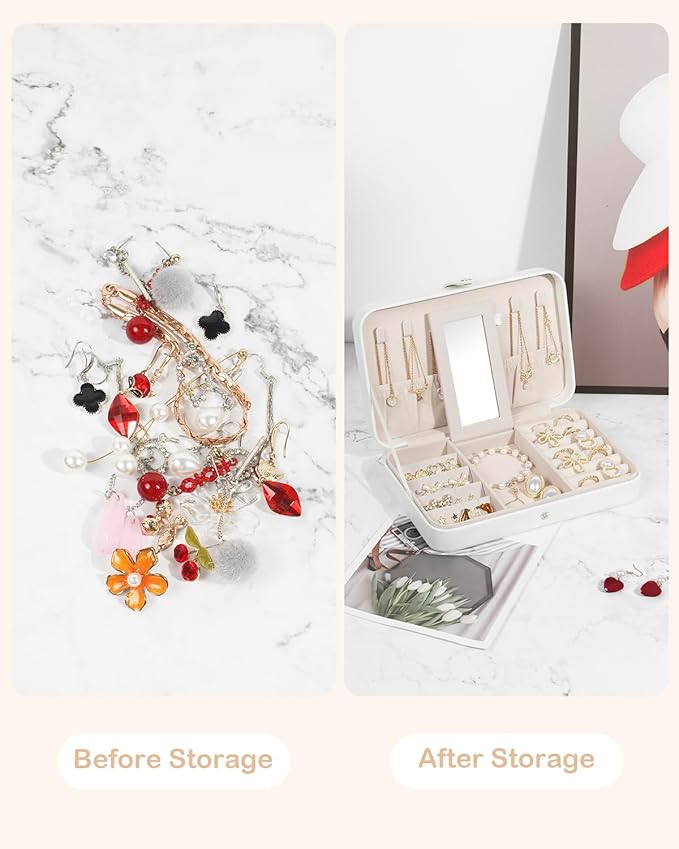 - Multiple storage compartments: This jewelry box features 7 necklace hooks with pockets, 7 ring rolls, 8 pairs of earring slots, and a multifunctional storage compartment for other small items. It offers ample space for organizing and storing your precious jewelry, ensuring that each piece remains easily accessible and in pristine condition.