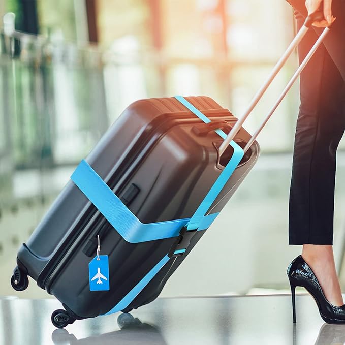 Weewooday 8 Pcs Luggage Straps Suitcase Tags Set for TSA Approved, 4 Travel Adjustable Suitcase Belt, 4 Silicone Luggage Tags with Name ID Card Travel Accessories(Blue,Airplane)
