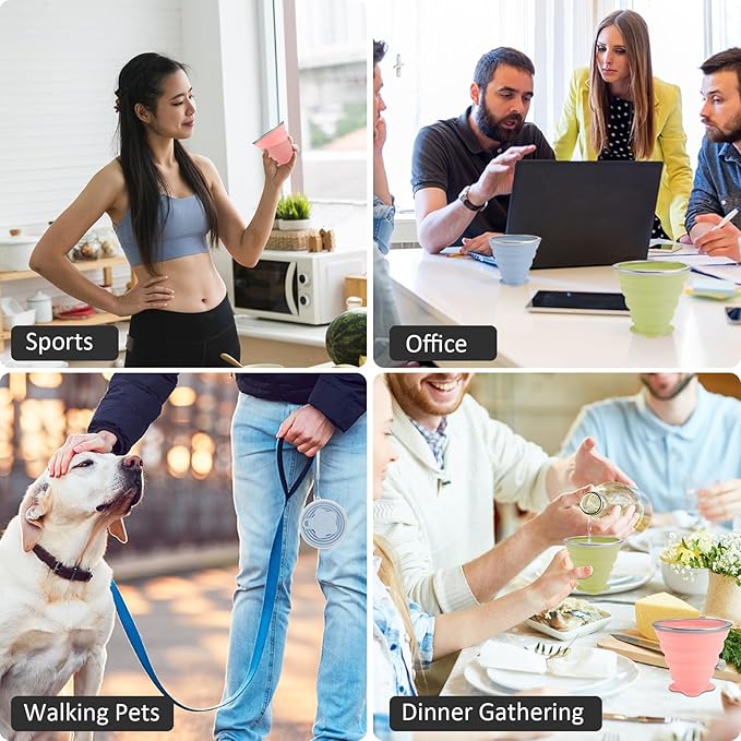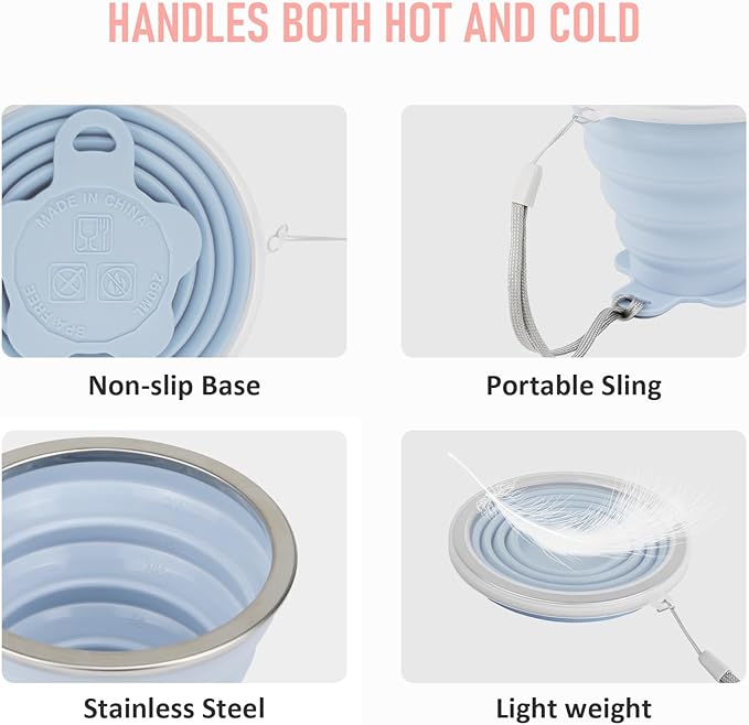 - HIGH QUALITY - The collapsible travel cups made of food grades silicone, guaranteed stainless steel rim and plastic lid, BPA Free. Easy to clean, non-toxic, odorless, non-staining, durable, flexible & reusable