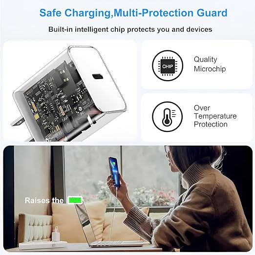 - Safety Guard: with intelligent chip inside, the iPhone charger automatically matches the current as your device's need. PD USB C charger block provides multi protections against over-current, over-voltage, over-heating,over-charge,over-temperature and short-circuit, keep your device safe while charging.