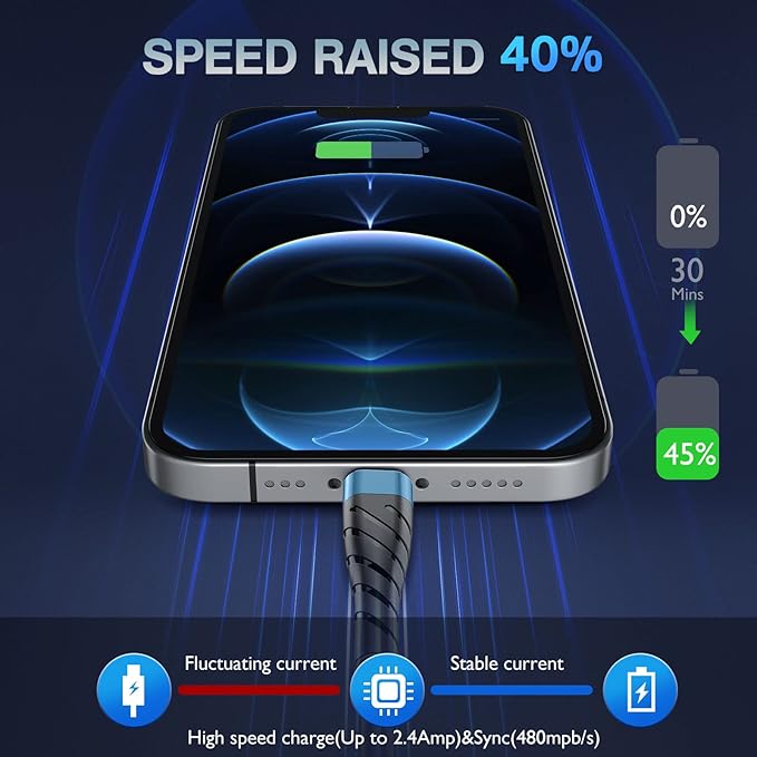 - [ Fast Charging & Data Sync 2 in 1 ] - 2.4 Amp(MAX) fast charging and 480mpbs/s data transmission, while preventing overheating and overcharging. Trickle charge and protect the device battery.