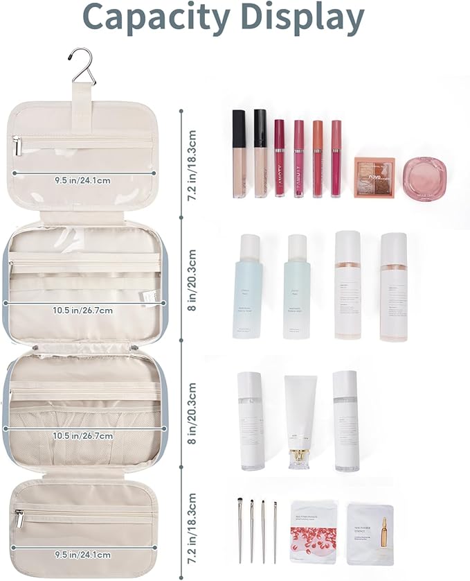 - NOT BULKY DESIGN - Large Capacity yet compact design, weighing 14 ounces. large metal hook allows hanging the toiletry case from towel rack, coat hook or whereever is available, making your toiletries and cosmetics displayed well for easy access