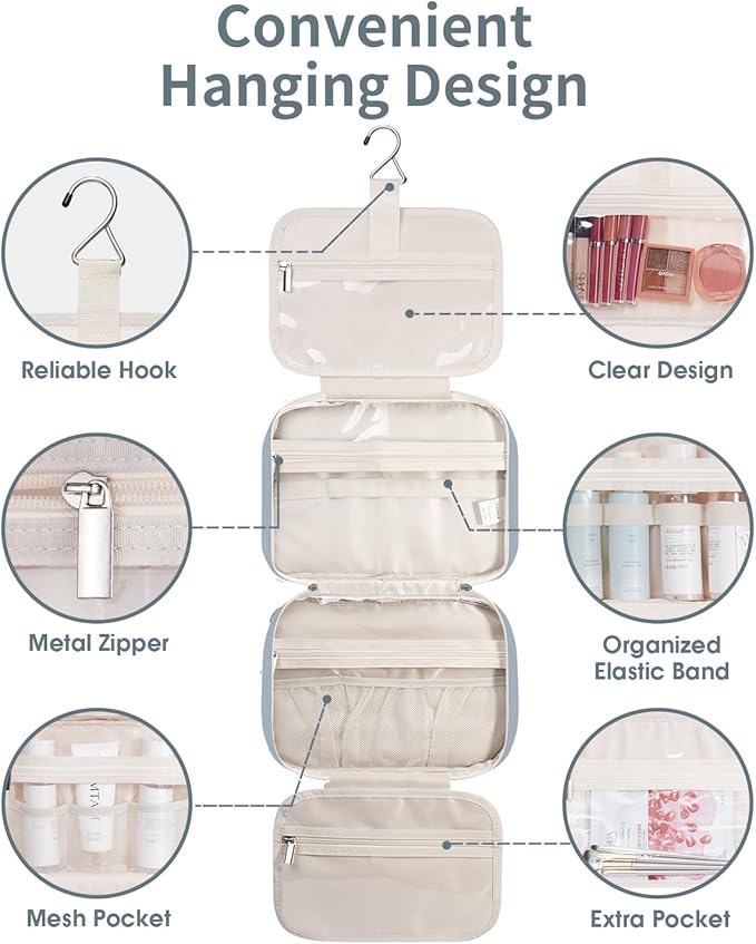 Narwey Hanging Toiletry Bag for Women Travel Makeup Bag Organizer Toiletries Bag for Travel Size Essentials Accessories Cosmetics (Greyish Blue (Medium))