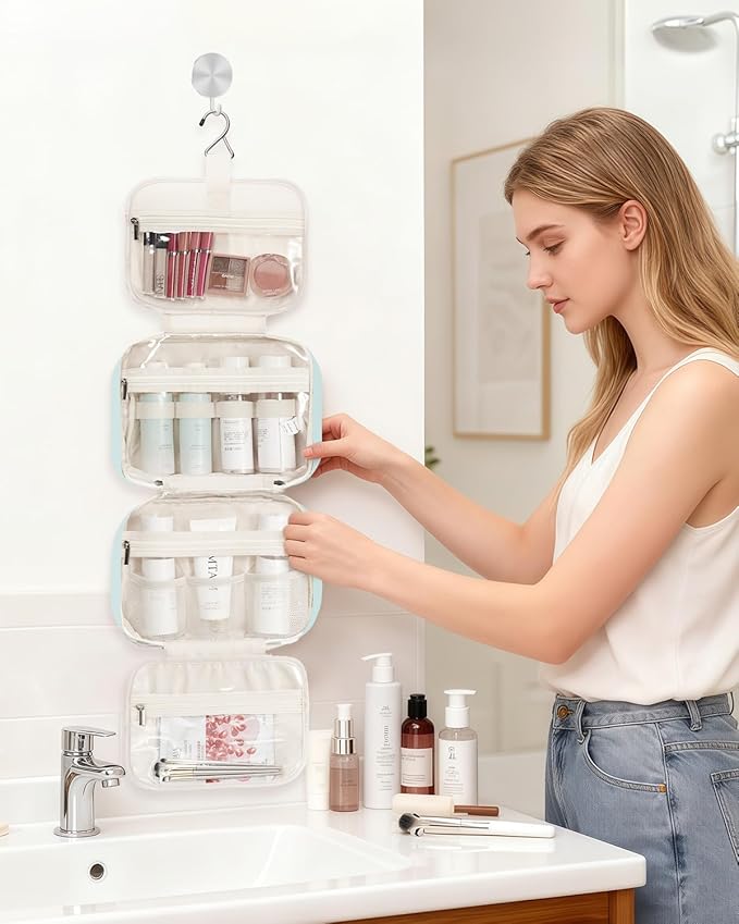 - NOT BULKY DESIGN - Large Capacity yet compact design, weighing 14 ounces. large metal hook allows hanging the toiletry case from towel rack, coat hook or whereever is available, making your toiletries and cosmetics displayed well for easy access