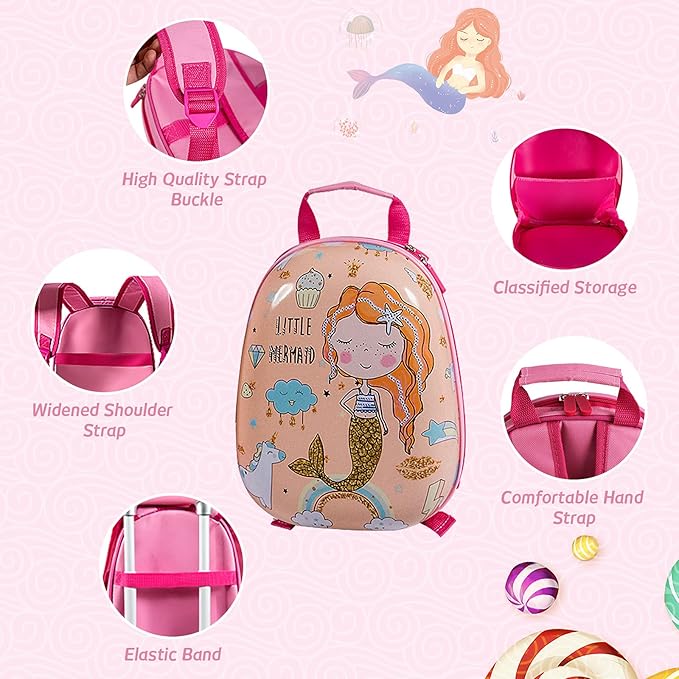 - 🧜♀️Quality Materials Makes for Durability: Made of non-toxic ABS, polycarbonate, and nylon materials, this kids luggage and backpack combo is built to accompany your kids throughout his or her childhood with its scratch-resistant and water-proof hard shell covered with the PC film. What’s more, the sleek waterproof body makes parents’ cleaning job a breeze.