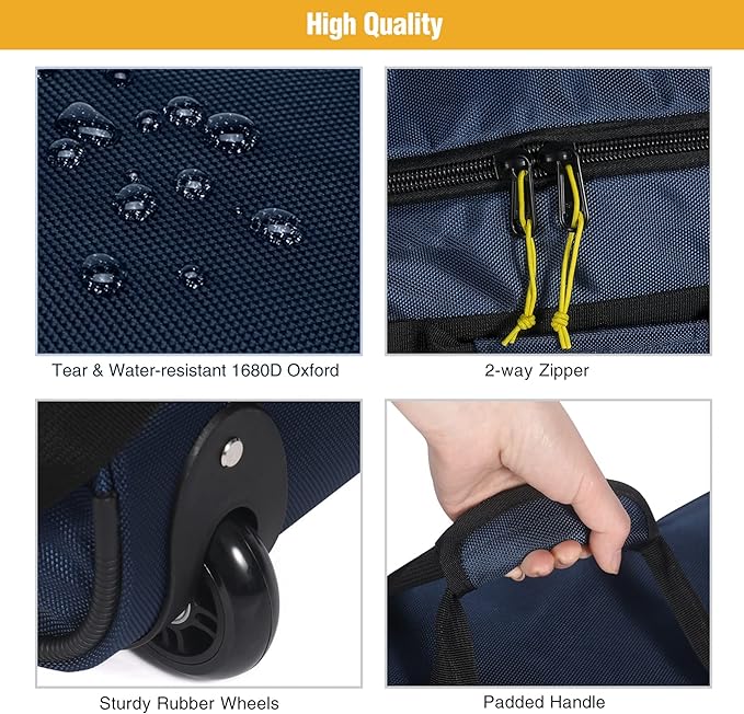 - Durable: Rolling Duffel Bag is made of high density water & tear resistant 1680D Oxford and 210D polyester. Reinforced stress points for durability. Large U-shaped zippered opening with 2-way zipper for easy packing.