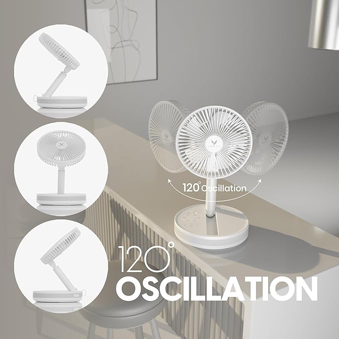 - THE ORIGINAL VENTY PORTABLE FAN - You’ve never experienced a rechargeable Battery Operated Fan like this. Venty Fan rechargeable fan is foldable, durable, extendable & sleek. It Oscillates 120°, rotates 180°, and only weighs 2.6lbs! Perfect for travels, at work, at home or as a camping fan.