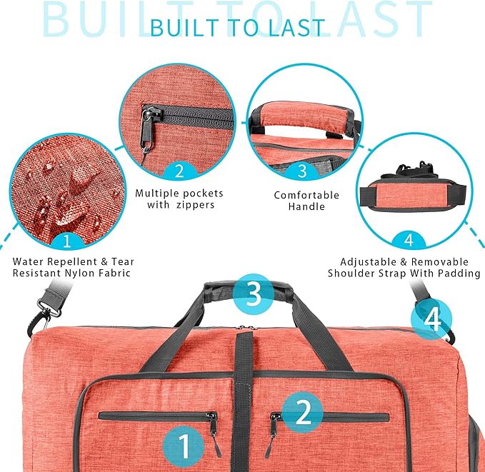 - High Quality Material: Made of waterproof and tear resistant 600D polyester. This foldable travel bag is featured with high quality zippers and pullers, built to last