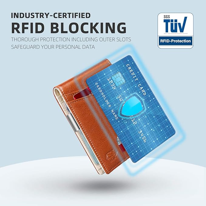- CERTIFIED RFID SECURITY - Our card holder features German institute-certified RFID SECURE Technology, effectively blocking RFID signals at 13.56 MHz and above, safeguarding your chip-stored data from unauthorized scans
