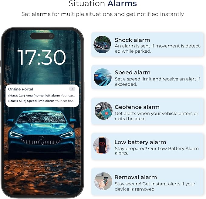 - MULTIPLE ALARMS - Test our systems trough our free demo version on v2.finder-portal.com/login. GPS tracker can send you alarm for various occasions. E.g. in the event of strong vibrations, exceeding the speed limit or a low battery level. You can easily set all alarms to your comfort and needs. Set up a geofence and keep track of the drivers via our app or webapp. Get an alarm when speed limits are reached, a geofence is surpassed or the battery is low