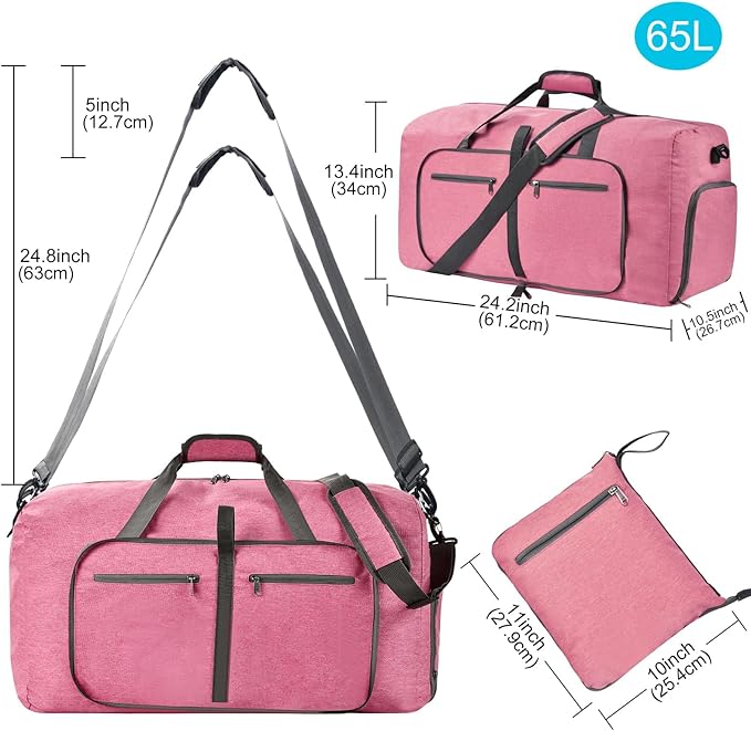 - 【Durable and Lightweight】This foldable duffle bag is made of water resistant and wear resistant fabric, with SBS premium zippers. It weighs only 1.2 pound and can be folded into a small pouch when not in use. It has a large size of 25 x 11.5 x 13.5 inch with 65 liters capacity, enough to hold your clothes, shoes, laptop and more.