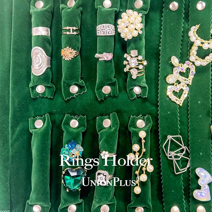 UnionPlus Velvet Travel Jewelry Case Roll Bag Organizer for Necklace Bracelet Earrings Ring, 6 PVC Pockets, Blackish Green Upgrade Version