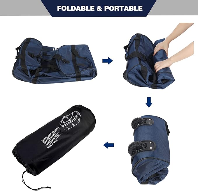 - Portable & Easy to Carry: The roller duffel bag can be folded easily to save the space. There are comfortable side carry handles for easy carrying. Unfolded size: 30’’x15.7’’x15.7’’/75x40x40cm, Folded size: 16.5’’x7.5’’x6.7’’/42x19x17cm.