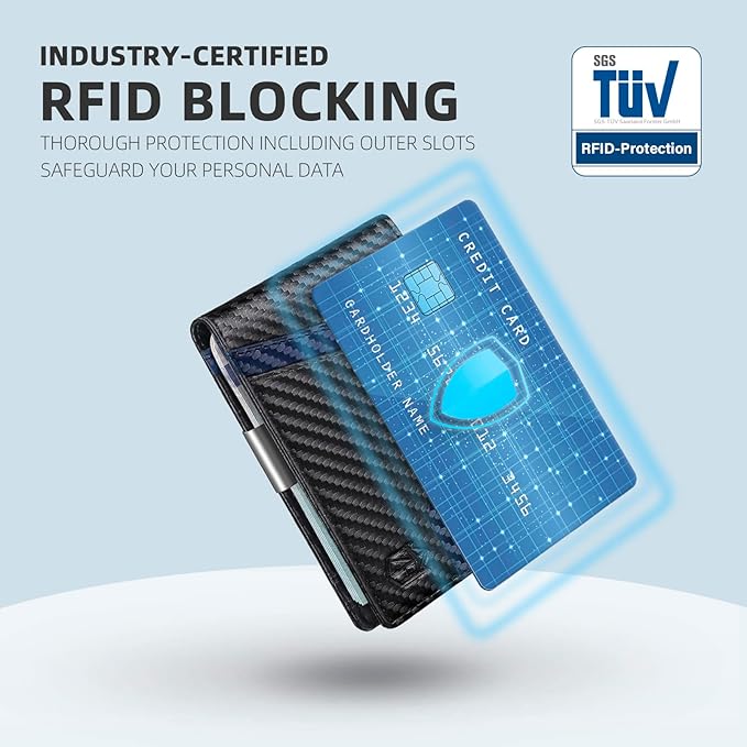 - CERTIFIED RFID SECURITY - Our card holder features German institute-certified RFID SECURE Technology, effectively blocking RFID signals at 13.56 MHz and above, safeguarding your chip-stored data from unauthorized scans