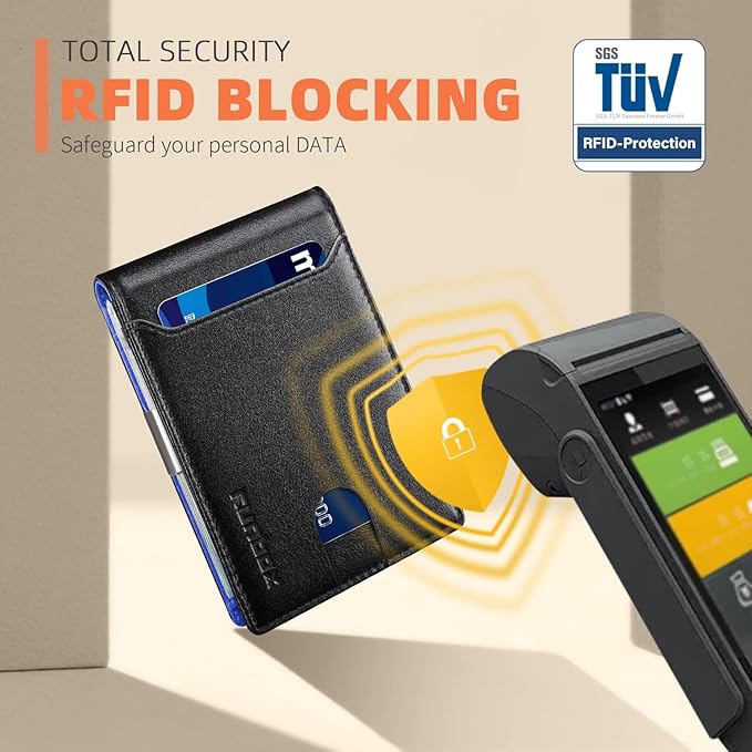 - 𝐑𝐅𝐈𝐃 𝐀𝐧𝐭𝐢-𝐓𝐡𝐞𝐟𝐭 𝐒𝐄𝐂𝐔𝐑𝐈𝐓𝐘 - this slim wallet for men equipped with German Instiute Certified RFID Security technology, a unique metal composite, engineered specifically to block 13.56 MHz or higher RFID signals to protect the valuable information and privacy