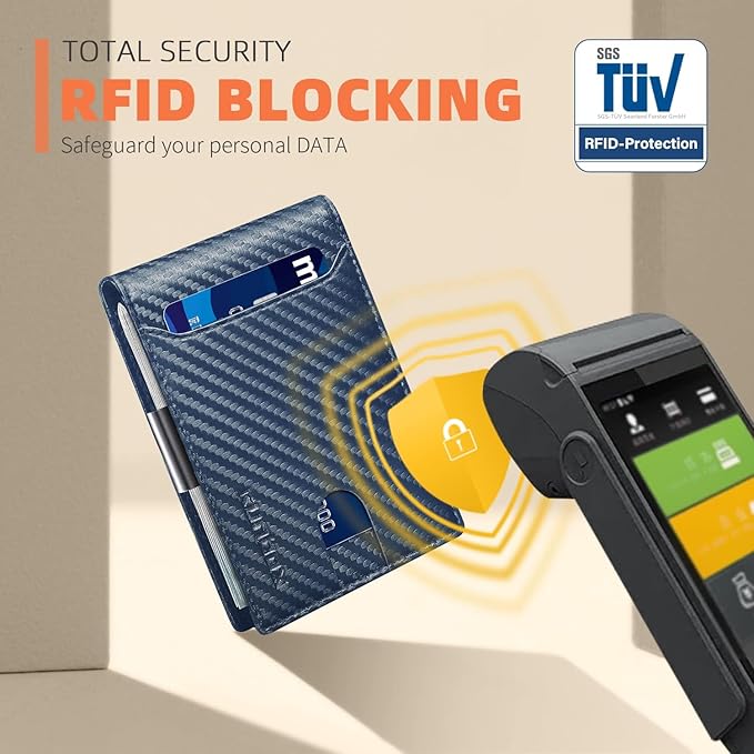 - 𝐑𝐅𝐈𝐃 𝐀𝐧𝐭𝐢-𝐓𝐡𝐞𝐟𝐭 𝐒𝐄𝐂𝐔𝐑𝐈𝐓𝐘 - this slim wallet for men equipped with German Instiute Certified RFID Security technology, a unique metal composite, engineered specifically to block 13.56 MHz or higher RFID signals to protect the valuable information and privacy