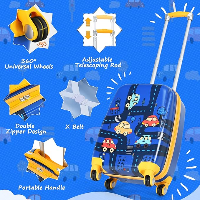 - 🚗Great Gift for Your Little One: This kids luggage and backpack set is delicately designed for children with cute colorful cartoon pattern. Its bright looking will attract kids' attention and improve their cognitive ability. Our hard shell luggage set will be an ideal gift ideal for children on many occasions such as birthdays or festivals.