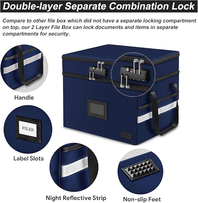 - Combination Lock Protection: Compared to other file cabinet which did not have a separate locking compartment on top, our 2 Layer File Box can lock documents and items in separate compartments for security. High-quality password lock provides maximum security for your valuables such as contracts, cards, certificates, conference materials, passports, etc. The package includes an instruction manual for a combination lock.The double zipper design makes it easier to open and close. No keys required